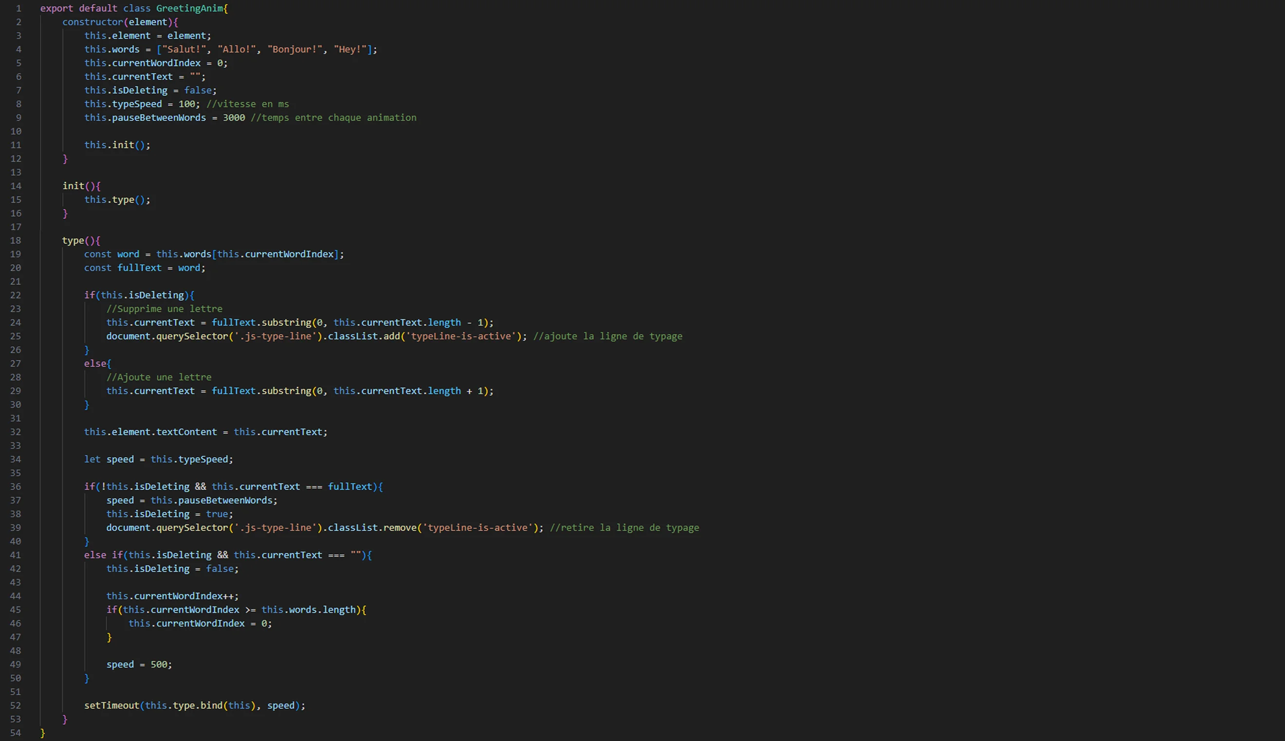Code composante JS animation salutation