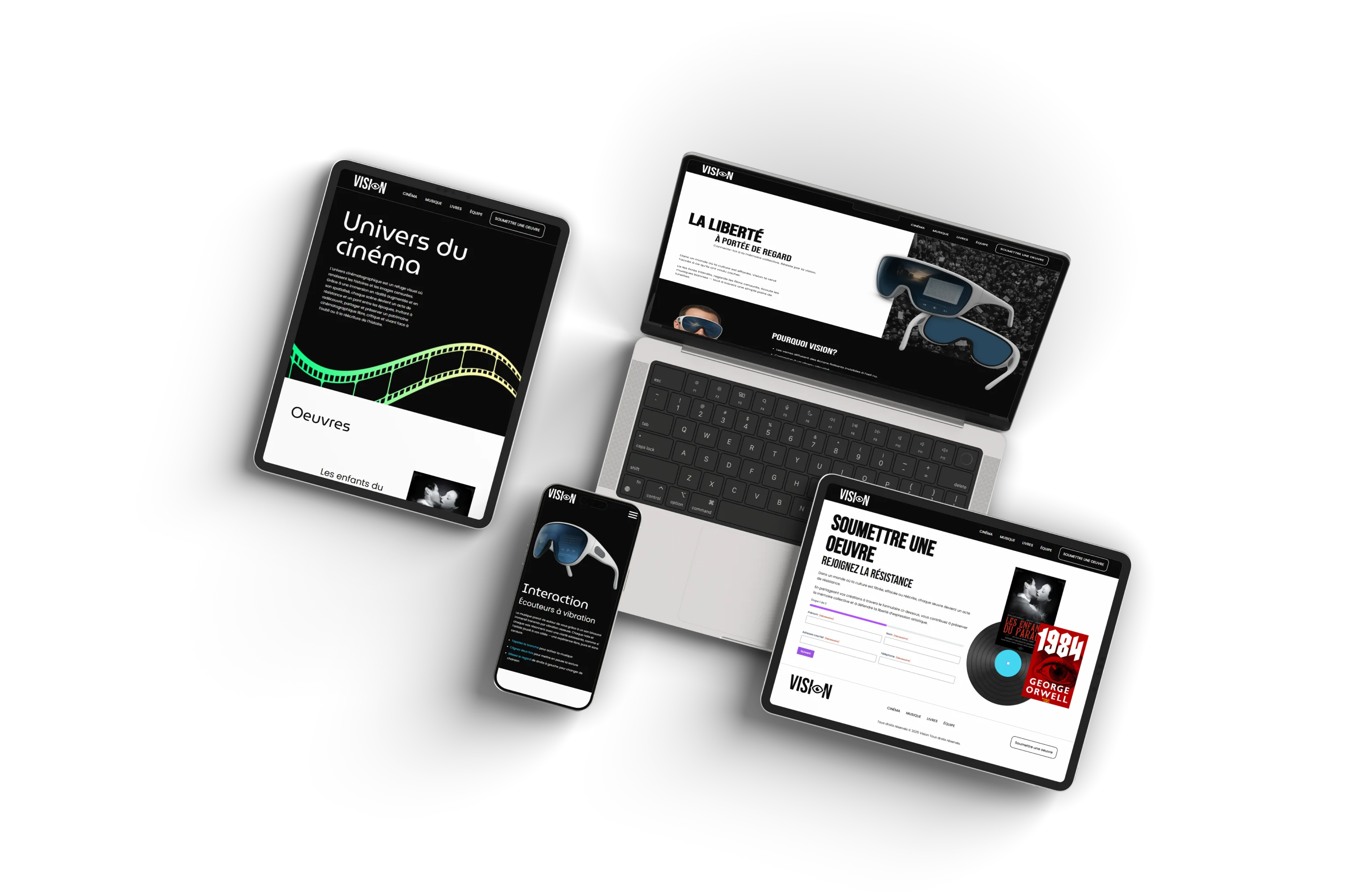 Vision est un site web créée lors d’un WebJam de 36 heures, présentant une paire de lunettes fictives permettant d’accéder à une culture bannie et censurée à travers une expérience sobre et immersive.